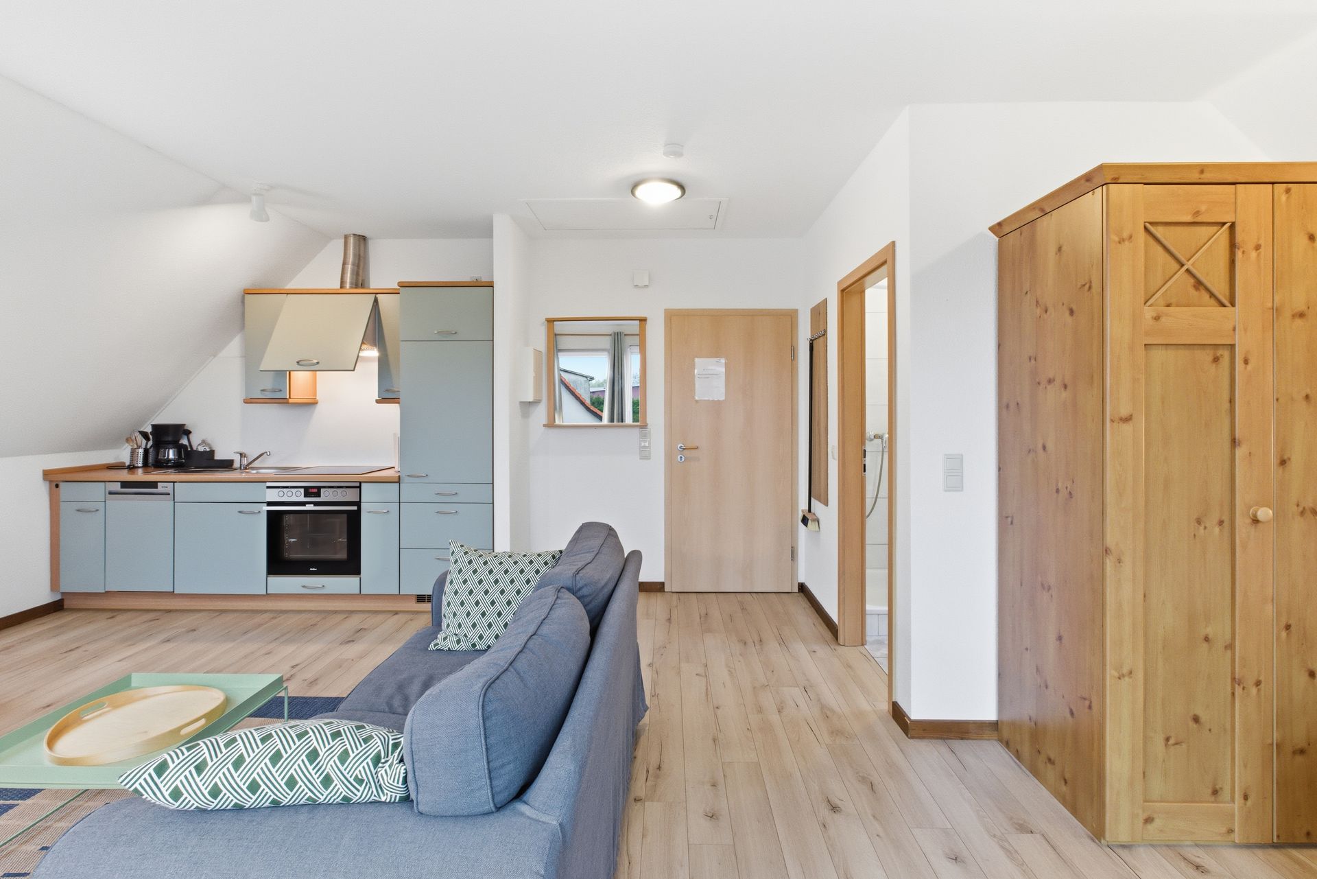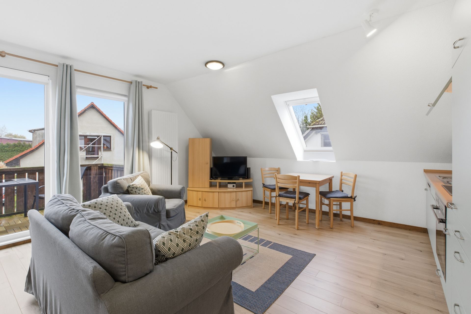 Das Apartment ist ausgestattet mit einer großen Sitzgruppe, Schränken, einem Duschbad, Küchenzeile, Esstisch und abgeteiltem Doppelbett. Die Ferienwohnung verfügt über einen geräumigen Balkon mit Sitzgruppe und Sonnenschirm.