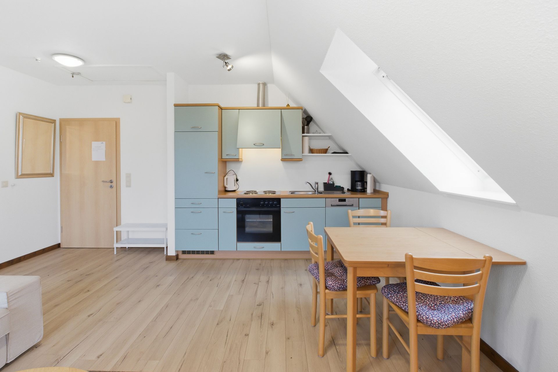 Das Apartment ist ausgestattet mit einer großen Sitzgruppe, Schränken, einem Duschbad, Küchenzeile, Esstisch und abgeteiltem Doppelbett. Die Ferienwohnung verfügt über einen geräumigen Balkon mit Sitzgruppe und Sonnenschirm.